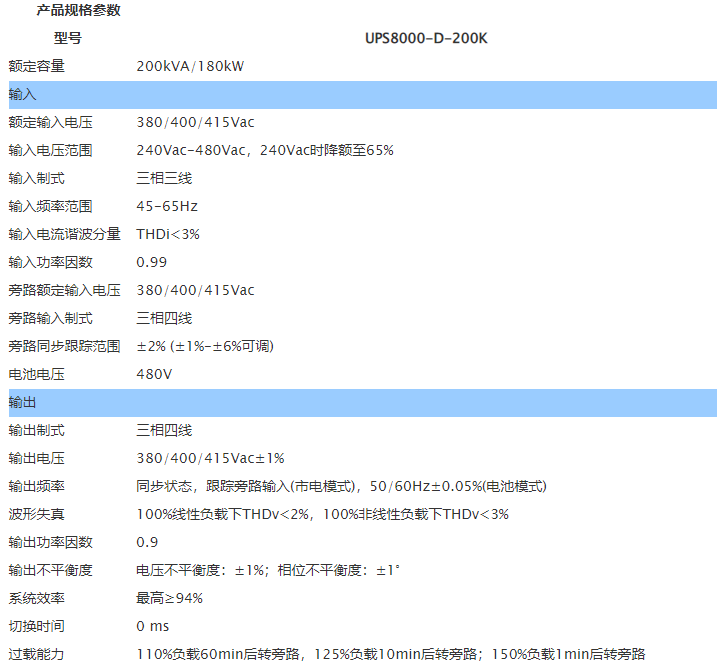 UPS8000-D-200K:輸出功率180KW/200KVA,根據(jù)負載功耗及并機數(shù)目選擇機型