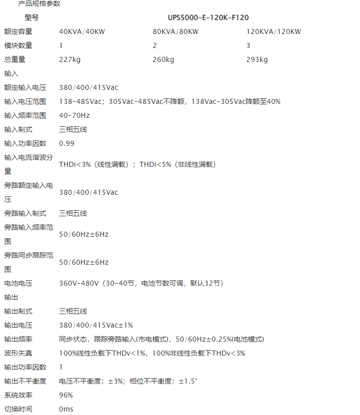 UPS5000-E-120K-F120:包含40kVA/40kW,80kVA/80kW,120kVA/120kW三種配置,分別對(duì)應(yīng)1、2、3個(gè)功率模塊,支持三相輸入,三相輸出;
