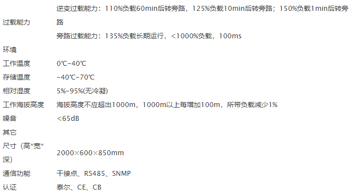 過(guò)載能力強(qiáng):逆變模式下,110%負(fù)載60min后轉(zhuǎn)旁路,125%負(fù)載10min后轉(zhuǎn)旁路,150%負(fù)載1min后轉(zhuǎn)旁路,150%以上負(fù)載200ms后轉(zhuǎn)旁路;旁路模式下,<135%過(guò)載長(zhǎng)期運(yùn)行